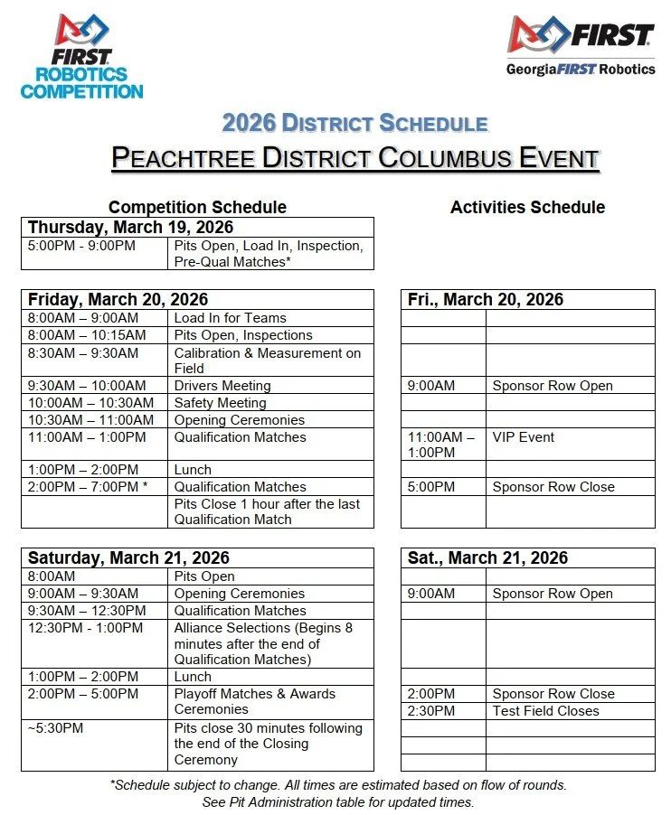 GeorgiaFIRST Robotics is excited to return to the Columbus Civic Center for our PCH District Qualifier in Columbus, Georgia. We’re thrilled to be able to come back to this venue location for 2026, and it is made possible by dedicated partners, sponsors and volunteers who give their time, talent and resources to FIRST. We invite you to join us on Friday, March 20th and Saturday, March 21st as FIRST Robotics Competition teams from the Peachtree District enter the field to test their engineering marvels. Who will walk away with the top awards at the Peachtree District Qualifier in Columbus? Join us to see!