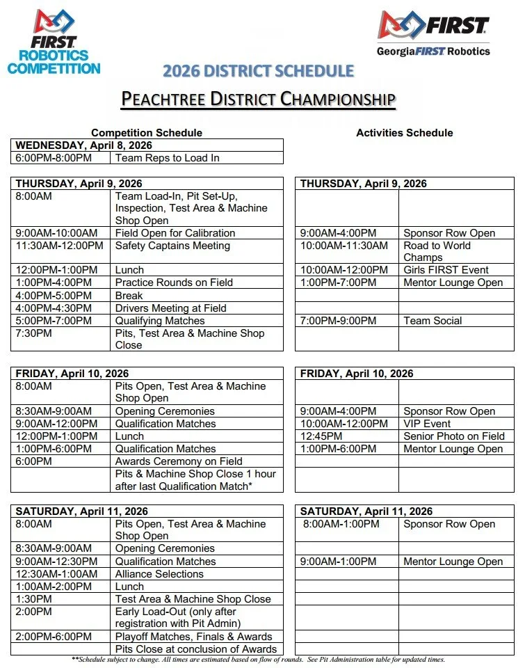 GeorgiaFIRST Robotics is pleased to host the Peachtree District Championship Event at the amazing Hawkins Arena at Mercer University. This exciting location is made possible by dedicated partners, sponsors and volunteers who give their time, talent and resources to FIRST. We invite you to join us on Thursday, April 9th, Friday, April 10th and Saturday, April 11th as FIRST Robotics Competition teams from the Peachtree District enter the field to test their engineering marvels one more time! The top 45 teams from the Peachtree District will receive an invitation to compete to determine the best in the District. Who will walk away with the top awards at the Peachtree District Championship and go on to represent our District at the FIRST World Championship in Houston? Join us to see!