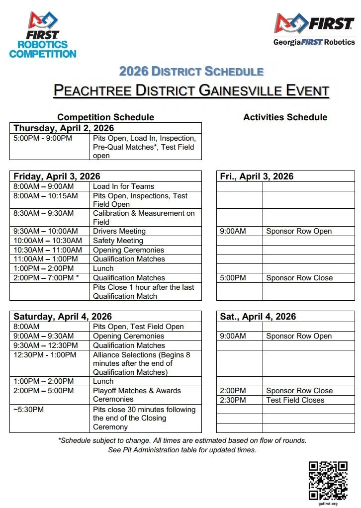 GeorgiaFIRST Robotics is honored to partner with Honeywell to host our Peachtree District Qualifier at Riverside Preparatory Academy for our Peachtree District Qualifier in Gainesville, Georgia. This longstanding location is made possible by dedicated partners, sponsors and volunteers who give their time, talent and resources to FIRST. We invite you to join us on Friday, April 3rd, and Saturday, April 4th as FIRST Robotics Competition teams from around the PCH District enter the field to test their engineering marvels. Who will walk away with the top awards at the Peachtree District Qualifier in Gainesville? Join us to see!